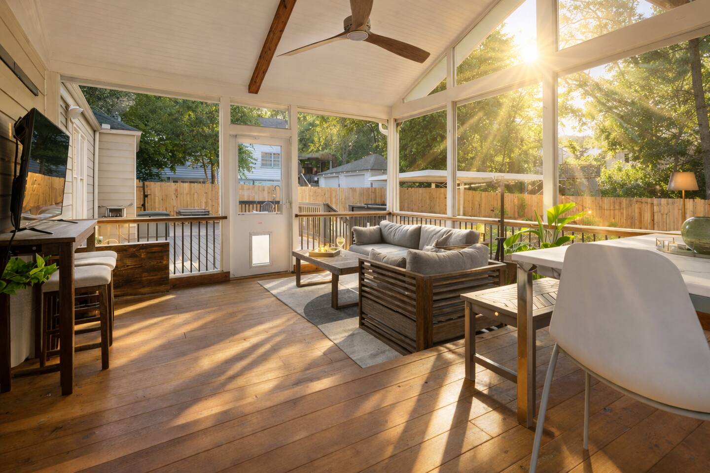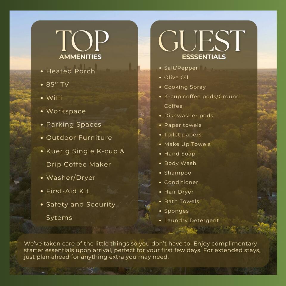 Free night value mentioned above is applied to the lowest-priced night within the reservation. Promotion valid for stays completed by February 28. Discount applied after booking or via inquiry. This home comfortably sleeps up to 9 guests and is designed for both gathering and privacy. 🛏️ Sleeping Arrangements • 2 King beds and 1 Queen bed, all with PURPLE brand mattresses for an exceptional night’s sleep • Large sleeper sofa and air mattress available • Pack ’n Play provided for infants 🛋️ Living & Entertainment • Two indoor living areas plus a dedicated outdoor living/dining space • 85” TV in the main living room • Smart TVs in all living areas with Netflix, Hulu, and Live TV included • Screened-in porch with heaters for cooler nights and a fan for summer comfort 💻 Work-From-Home Friendly • Dedicated workspace in the second bedroom • Desk setup with dual monitors • Fast, reliable Wi-Fi ideal for remote work and video calls 🎲 Fun & Games Enjoy a variety of games for all ages, including Jenga, cornhole, a putting mat, Rummikub, and dominoes — perfect for downtime or friendly competition. ⸻ Outdoor Space • Large fenced-in front and back yards, great for kids and pets • Screened porch ideal for morning coffee or evening wind-downs • Plenty of space to spread out and relax ⸻ Kitchen, Laundry & Comfort You’ll have everything you expect — and more — including a full kitchen, laundry, fast Wi-Fi, smart TVs, and complete privacy. This home offers the convenience of a house with the comfort and consistency guests don’t get from basic hotel stays. ⸻ Security & Access For peace of mind, the home is equipped with: • Vivint doorbell camera • Backyard security camera • Custom-coded keyless entry Free off-street and on-street parking is available — no garages, decks, or parking fees to worry about. ⸻ Location 📍 Located in Decatur, GA, close to: • Downtown Decatur dining, shops, and nightlife (walkable) • Emory University & Emory Village • CDC headquarters • Easy access to Atlanta attractions including Mercedes-Benz Stadium, State Farm Arena, Fox Theatre, Georgia Aquarium, World of Coca-Cola, and more • Nearby parks like Glenlake Park, Decatur Toy Park, and Mason Mill Park • Decatur MARTA Station for convenient public transportation ⸻ Booking Both Homes Traveling with a larger group? ✨ A separate private tiny home on the property sleeps 6, for a total of 15 guests when booked together. Inquire if you’re interested in reserving both homes while maintaining privacy.